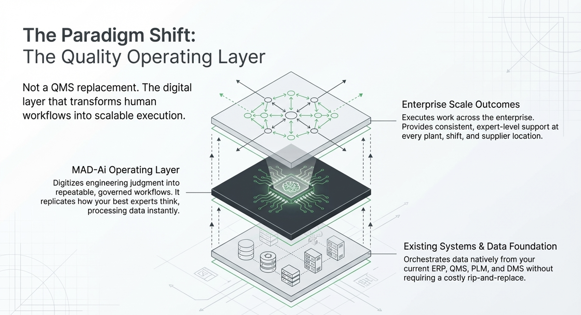 MAD-Ai is not just a bot or QMS replacement. It is an operating layer that digitizes engineering judgment into repeatable, governed workflows. Deploy consistent, defensible quality execution across plants, suppliers, and regions — without ripping out your existing systems.